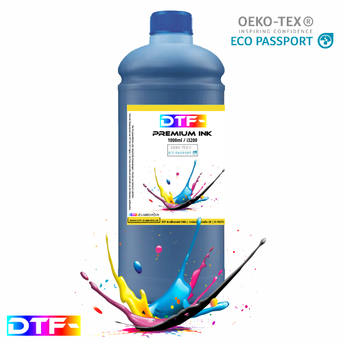 Die DTF Tinten sind in 1.000ml Gebinden verfügbar und sind speziell für mittel & großformatige Rollendrucksysteme. Tinten sind nach ECO PASSPORT by OEKO-TEX® zertifiziert.